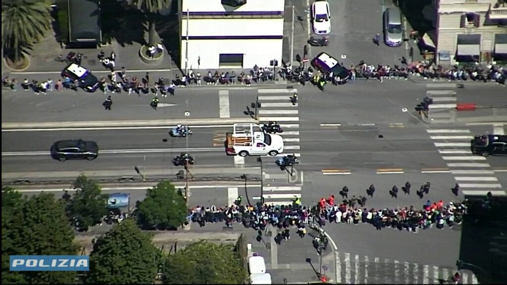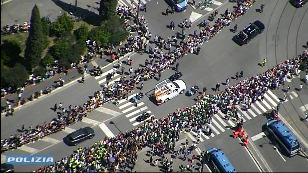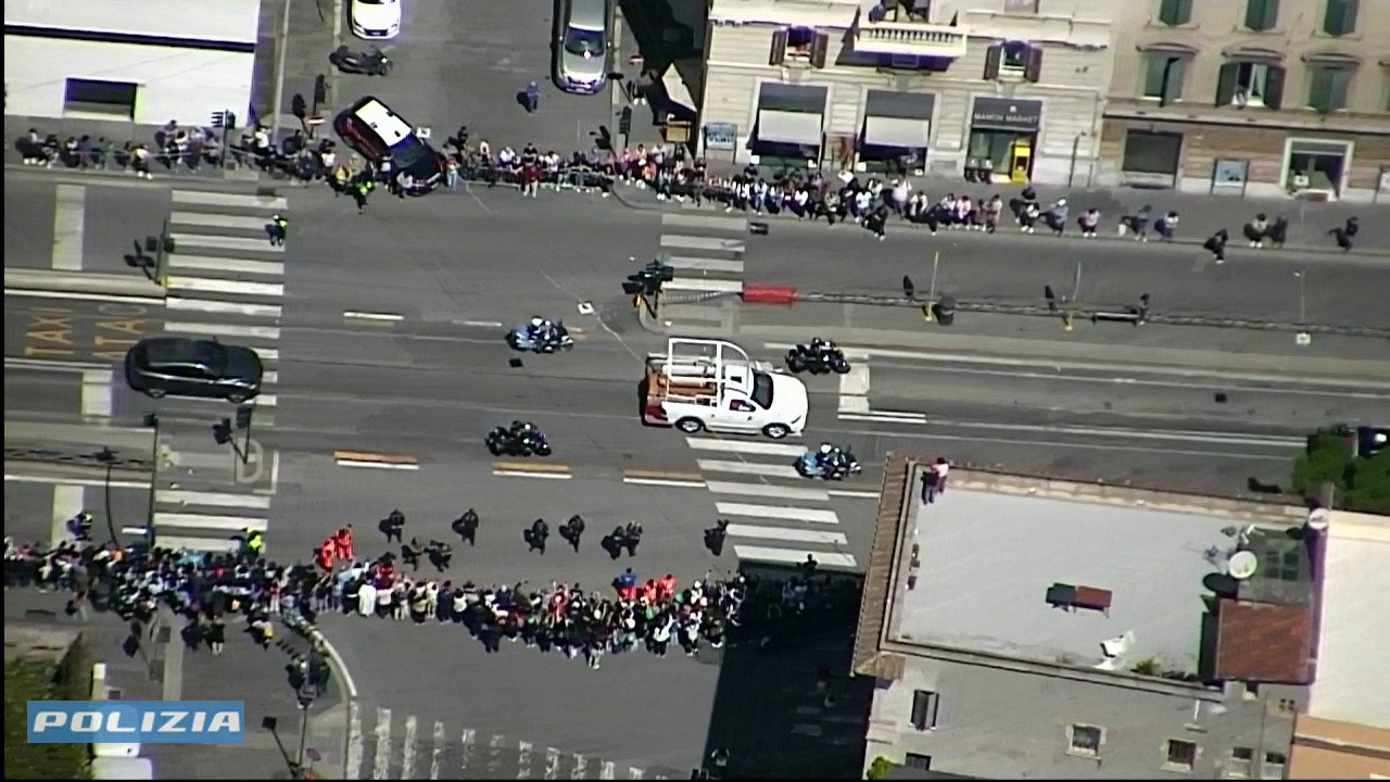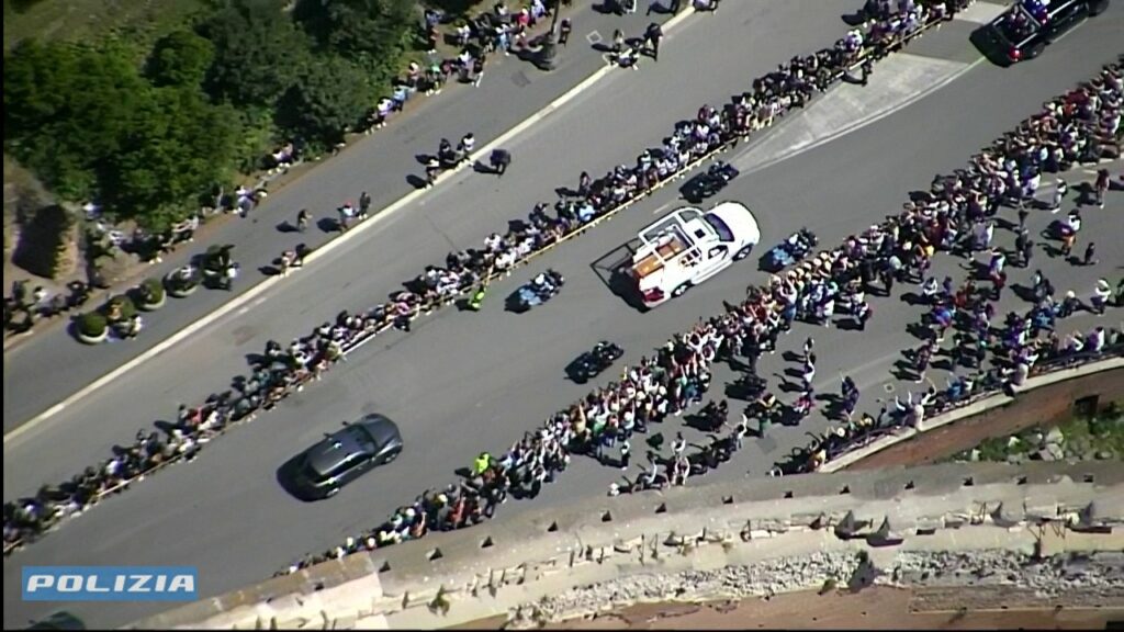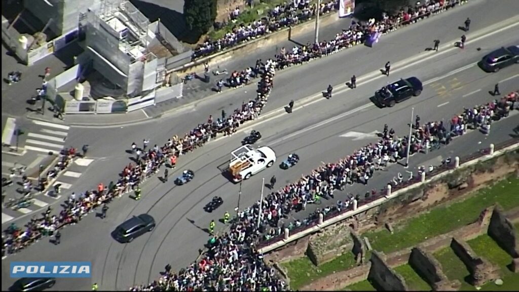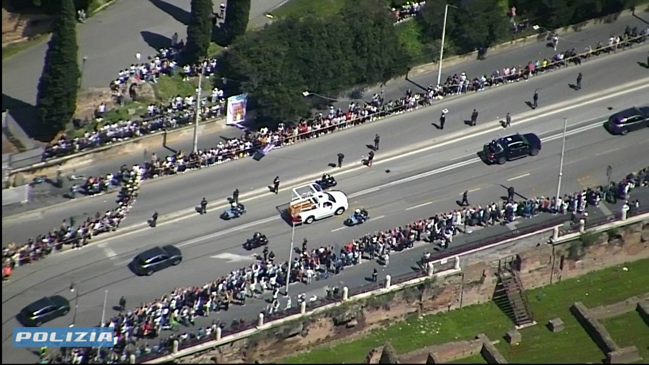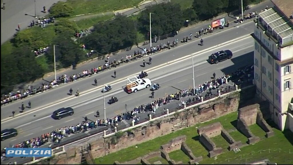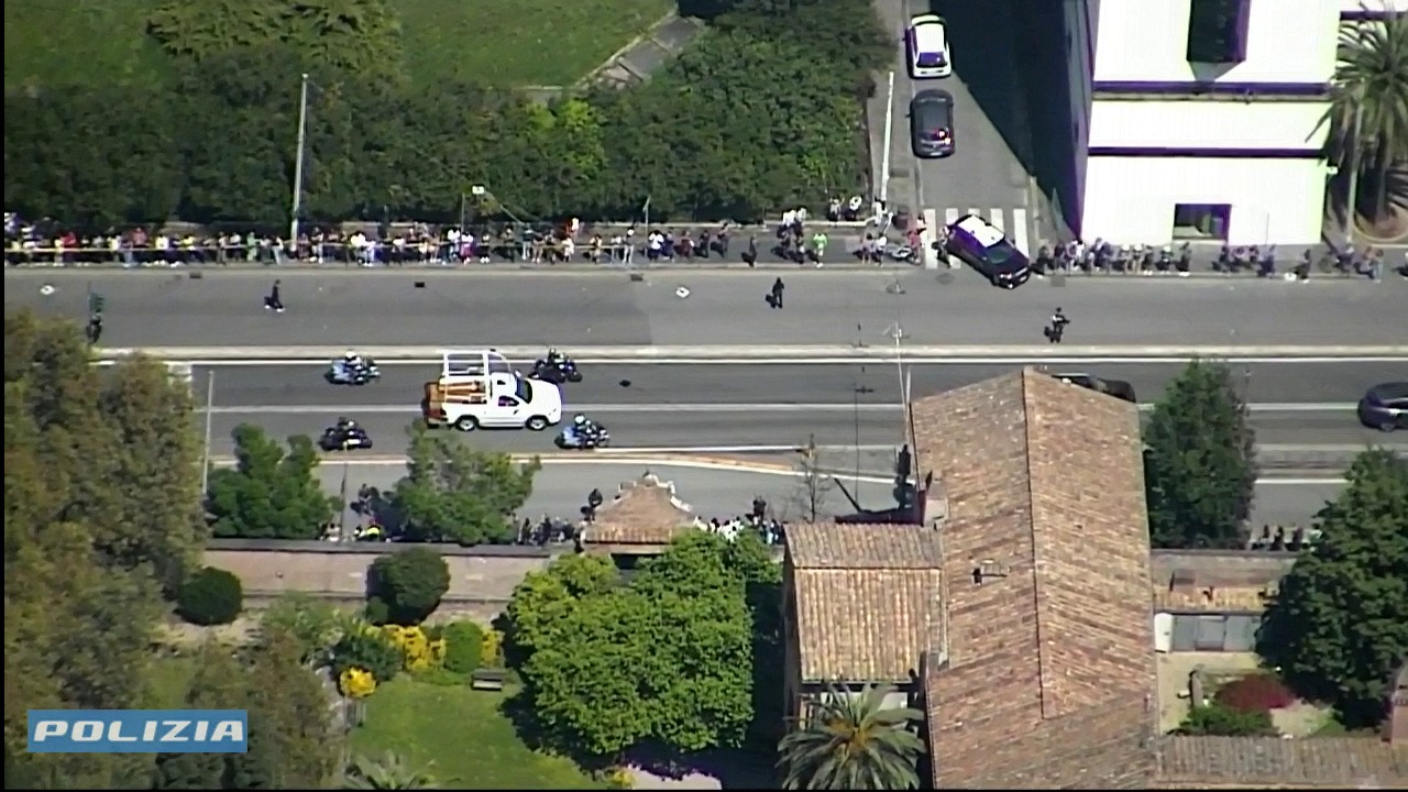 Conclusa la celebrazione, il feretro di Francesco è stato condotto fuori dalla Basilica e adagiato su una papamobile riadattata, utilizzata precedentemente in un viaggio in Oriente. Il corteo ha lasciato il Vaticano attraversando la Porta del Perugino, sfilando davanti a Casa Santa Marta e proseguendo nel centro di Roma.