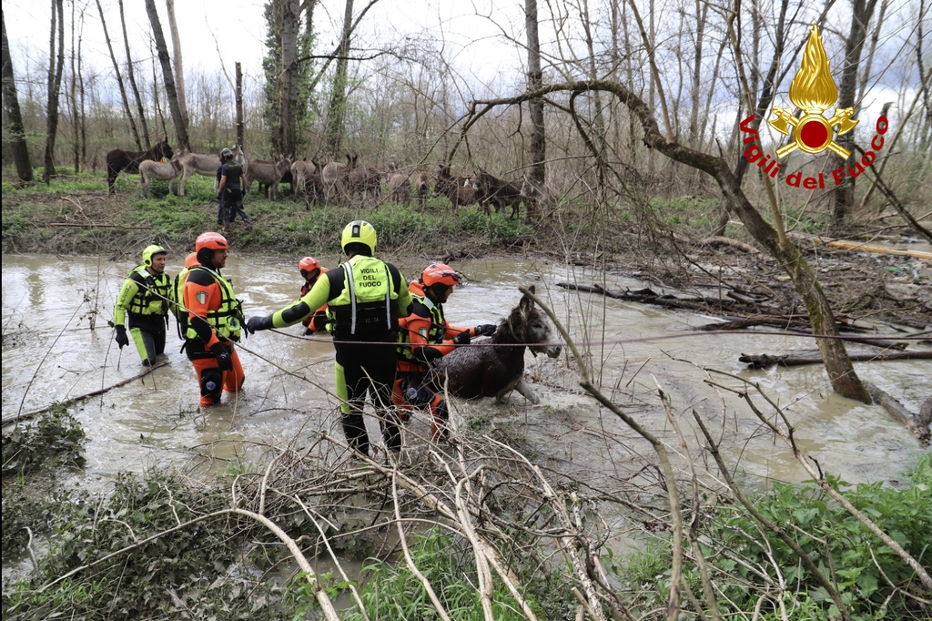 I Vigili del fuoco di Arezzo e Montevarchi, insieme ai Soccorritori Acquatici di Arezzo e ai sommozzatori di Firenze, sono impegnati a Terranuova Bracciolini nel salvataggio di circa 80 asini intrappolati su due isolotti nel fiume Arno, a valle della diga di Levane, a causa dell’aumento del livello dell’acqua. Alcuni animali sono stati aiutati ad attraversare il fiume, mentre altri hanno utilizzato una passerella galleggiante costruita dai Vigili del fuoco. Le operazioni di salvataggio sono complesse ma stanno per concludersi. Sul posto anche i Vigili del fuoco di Siena, veterinari della ASL e personale del Comune.