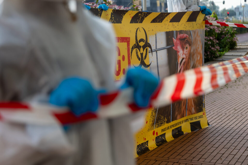 Il giorno successivo, un’altra dimostrazione ha avuto luogo davanti alla stessa sede. Durante l’evento è stato mostrato un grande striscione e l’area è stata simbolicamente designata come “zona contaminata”, non per motivi ambientali, ma per la responsabilità dell’azienda nell’impiego continuato di sistemi di allevamento in gabbia all’estero.