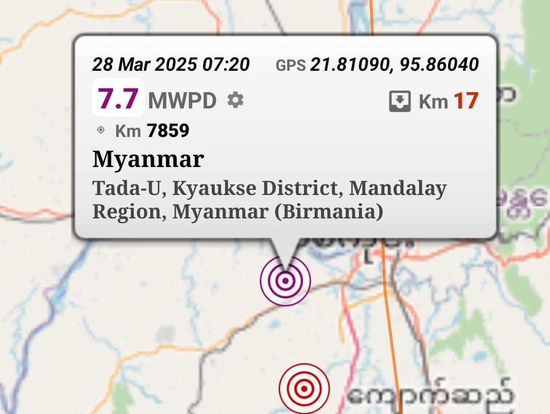 Un fortissimo terremoto di magnitudo 7.7 della Scala Richter ha colpito oggi la parte centrale del Myanmar. Lo ha reso noto l’Usgs, l’istituto geologico americano, secondo cui l’epicentro del sisma è stato localizzato 16 chilometri a nordovest della città di Sagaing, a una profondità di 10 chilometri, alle 14.20 ora locale, le 7.20 in Italia. Il sisma è stato avvertito anche in Thailandia, dove in seguito alla forte scossa sono stati evacuati uffici e negozi a Bangkok e nella provincia sudoccidentale cinese dello Yunnan. Giornalisti dell’Afp a Naypyidaw, capitale dell’ex Birmania, hanno visto strade divelte dopo la scossa e pezzi di cornicioni dei palazzi nelle vie.